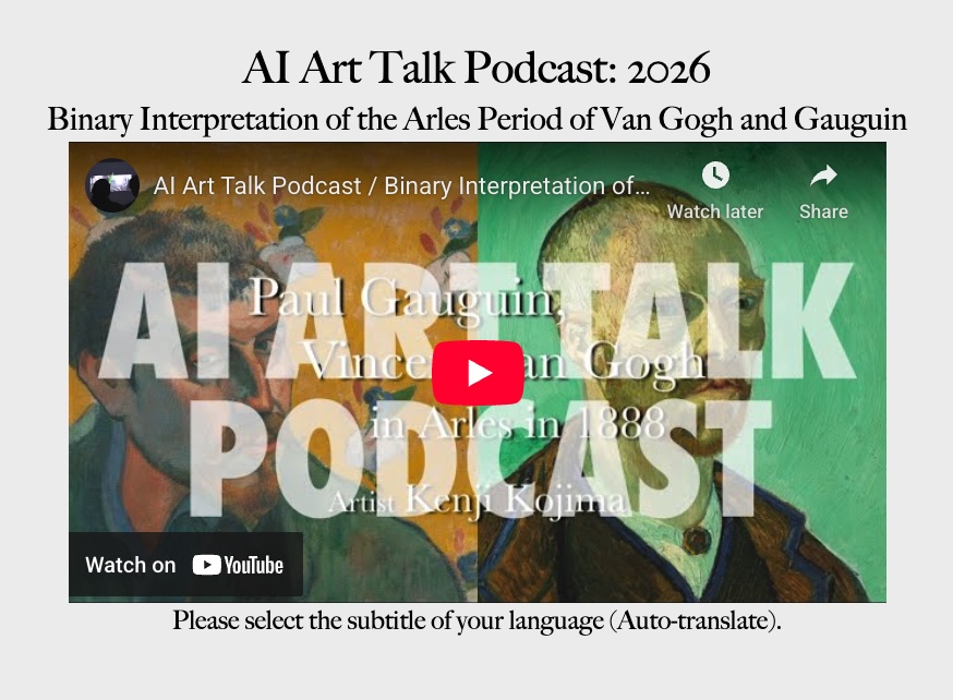 After COVID-19, he could not go out to shoot a video, but he found numerous archival artworks online. He launched a new series titled "The Musical Interpretation of Paintings" which transforms classical image data such as paintings, photographs, and films into music. Artist Kojima believes that the sensory organs construct the world by extracting only certain components from the chaos, such as visual and auditory information, like a filter. So we create our world with the "key" of the sensory organs as if we were deciphering a code. In 2023, "Bitwise Splitting and Merging of Pixels" began with the self-question, "With the development of generative AI, can we create visual art that is not an assemblage of past visual data? Currently, all media is recorded in binary form. This fact leads to the manipulation of color pixels using bitwise operations. He created encryption-decryption projects like "The Da Vinci Code" and others. In 2024 he started an Anthropocene and ecological participatory video art project called "This Planet is Our Home".